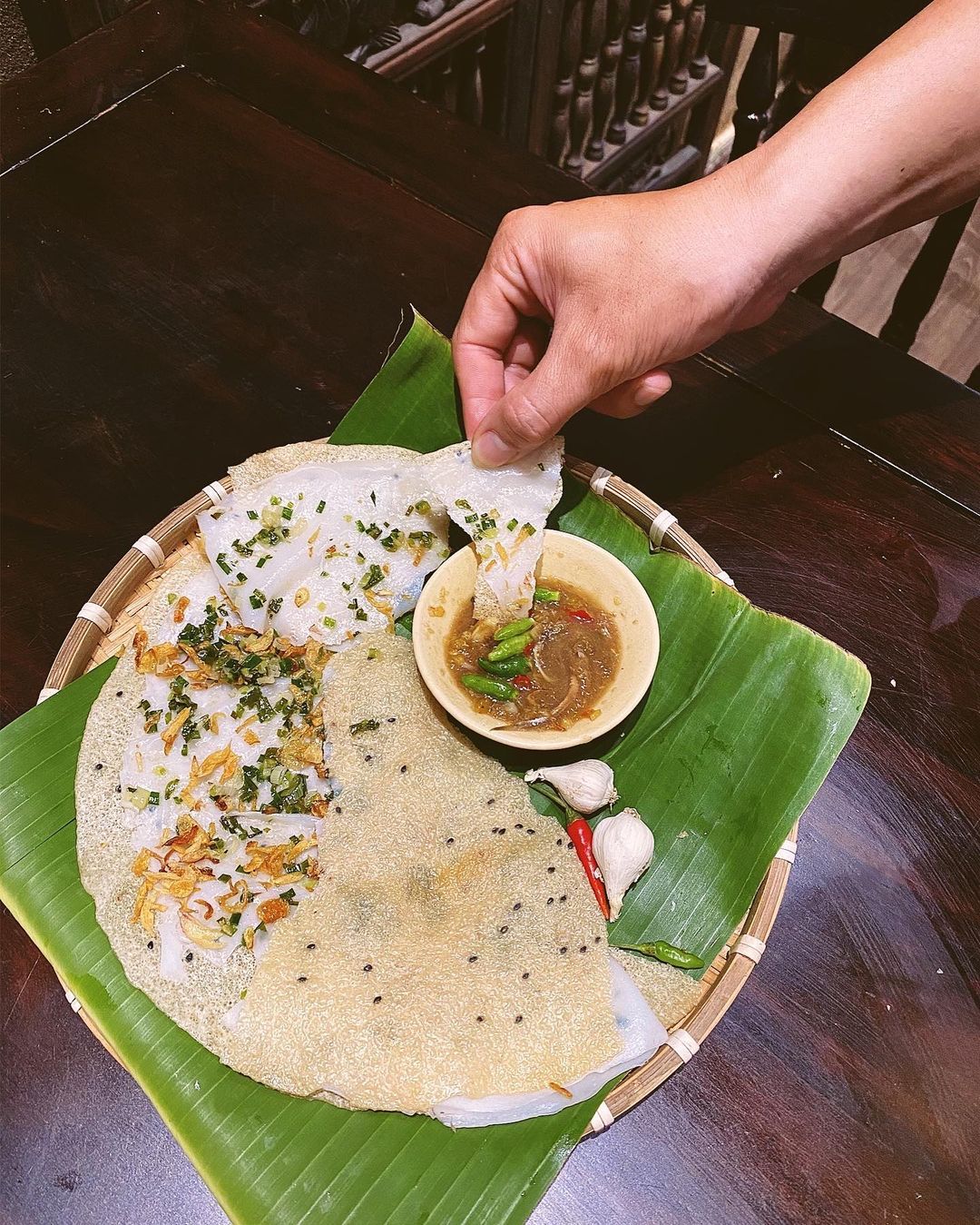The dish comprises two main layers: the crispy outer layer of grilled rice paper and the inner soft layer of wet rice paper, often topped with fried scallion oil, shrimp powder, minced meat, or mashed green beans. Diners use both hands to clap the two layers together—a gesture that inspired the dish's name. The ideal Banh Dap is thin to deliver the best flavor.