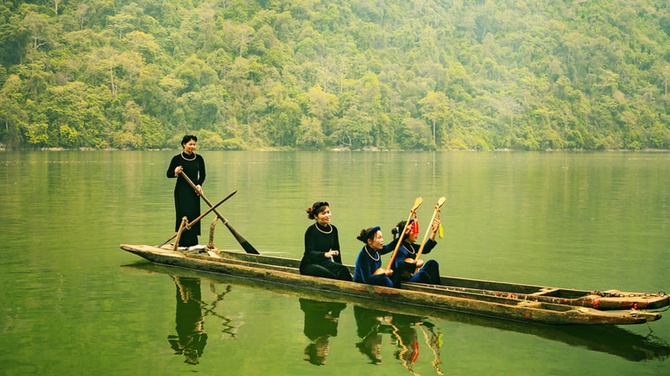 Women of ethnic minority Tay rowing a dugout on Ba Be Lake, Bac Kan, Vietnam