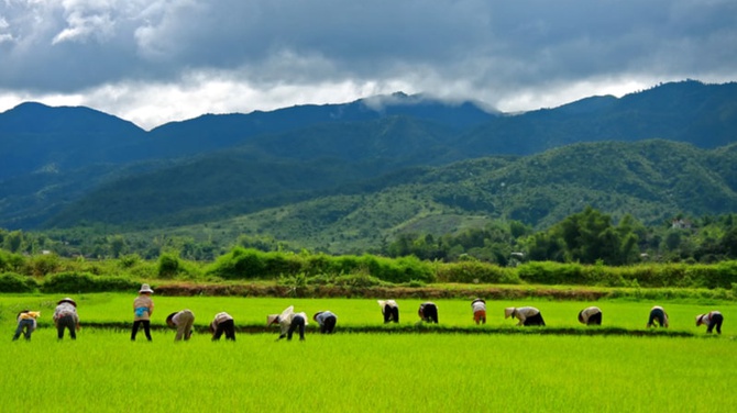 A group of unidentified farmer working in a field at Dien Bien Phu, Dien Bien, Vietnam
