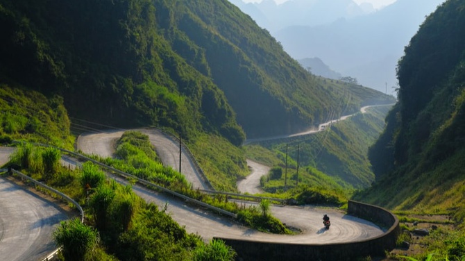 Motorbikers on winding roads through valleys and karst mountain in Dong Van, Ha Giang, Vietnam