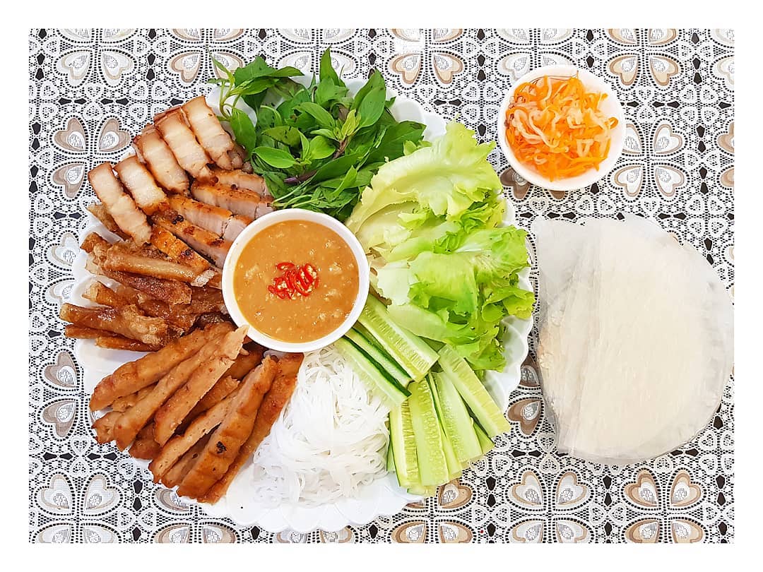 A typical serving of Ninh Hoa grilled pork rolls includes grilled meat, lettuce, fresh herbs, sliced cucumber, star fruit, and mango, all wrapped in rice paper and enjoyed with dipping sauce.