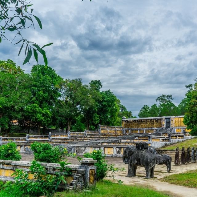 Despite being the most remote among the tombs of the emperors, Gia Long Tomb stands out for its stunning natural surroundings, characterized by vast mountains, pine forests, and pathways adorned with grass and wildflowers. The complex, surrounded by 42 mountains and hills, derives its name from the largest mountain within it: Dai Thien Tho.
