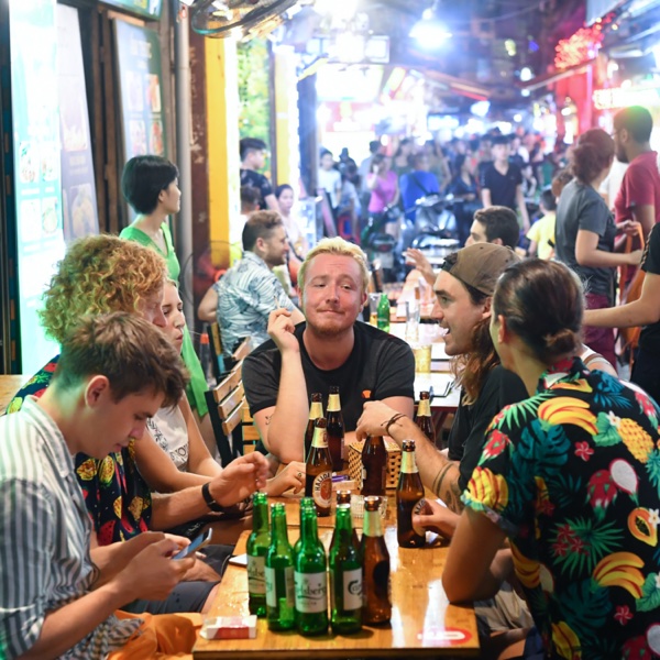 Tourists enjoy beers on Ta Hien street in Hanoi