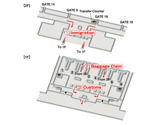 Arrival Map of Floor 1 and 2 - HCMC AirportOn the first floor, you'll find baggage claim and customs services. Collect your luggage and clear customs before exiting. Restrooms are located at both ends of this level. Currency exchange booths are available just outside customs, allowing you to exchange money for Vietnamese Dong.