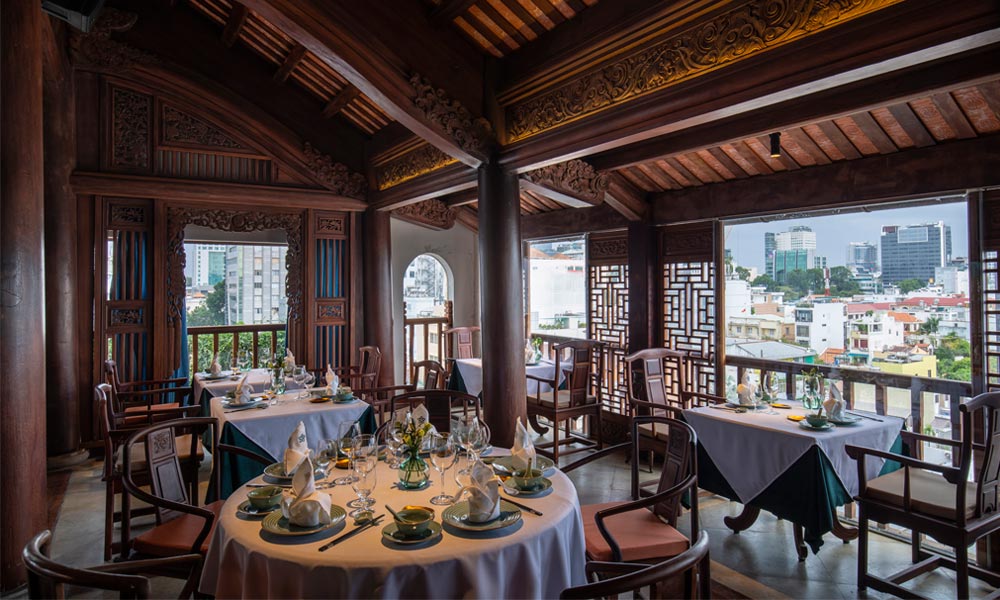 Perched atop a residential building in District 1, Hoi An Sense invites diners to experience a slice of historical Saigon. The renovated space exudes charm with its use of 300-year-old Lim wood, colorful hanging lanterns, and a serene fish pond, evoking the ambiance of ancient Vietnamese architecture. The warmth of its design creates a cozy atmosphere that removes the hustle and bustle of the city.