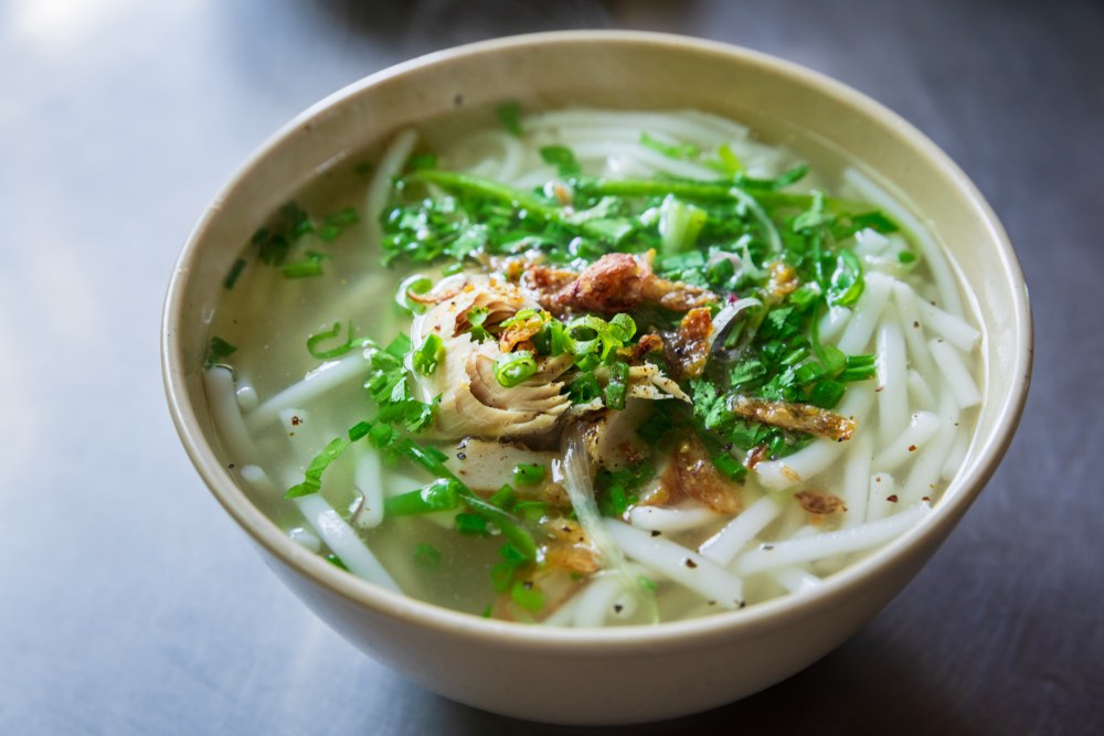 While Nem Nuong serves as a delightful snack throughout the day, a bowl of Bun Cha Ca Nha Trang is perfect for breakfast, lunch, or dinner. The broth is crafted from fish mackerel bones, and thick rice vermicelli is enjoyed alongside fried fish cakes, fish balls, vegetables, tomatoes, green onions, and even some slices of pineapple. The flavors harmonize exquisitely, creating a satisfying, not overly fishy, natural sweetness from the fish.