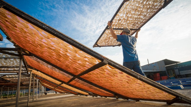 Man carrying dry fish in the yard, Rach Gia, Kien Giang, Vietnam