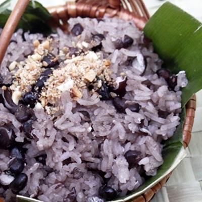 Sticky rice made with black beans, creating a unique and hearty flavor.