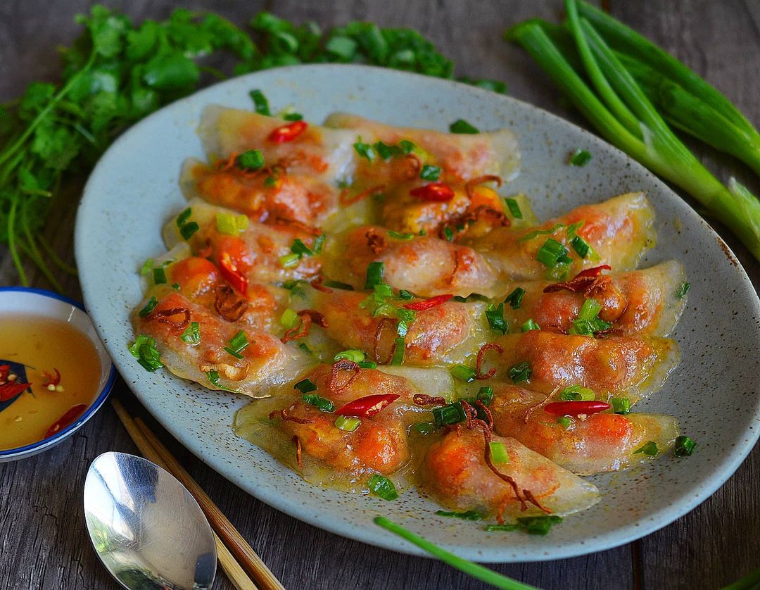 Banh beo refers to delicate steamed rice cakes filled with a variety of ingredients such as minced shrimp, green bean paste, spring onion, and crispy fried shallots. This combination creates an appealing appearance with a refined flavor. Banh beo may be small but can be quite rich, making it best enjoyed with a savory dipping sauce.