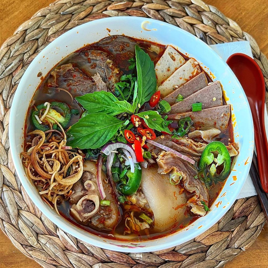 This Vietnamese beef noodle dish made in the Hue style remains a hearty noodle feast in 2025. Sliced beef, noodles, crab balls, meatballs, and cubes of congealed pig's blood are all immersed in a spicy broth infused with the aromatic essence of lemongrass. The dish is complemented by fresh herbs, bean sprouts, and onions.