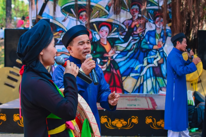 Artists in traditional costume performing Quan ho Bac Ninh folk music