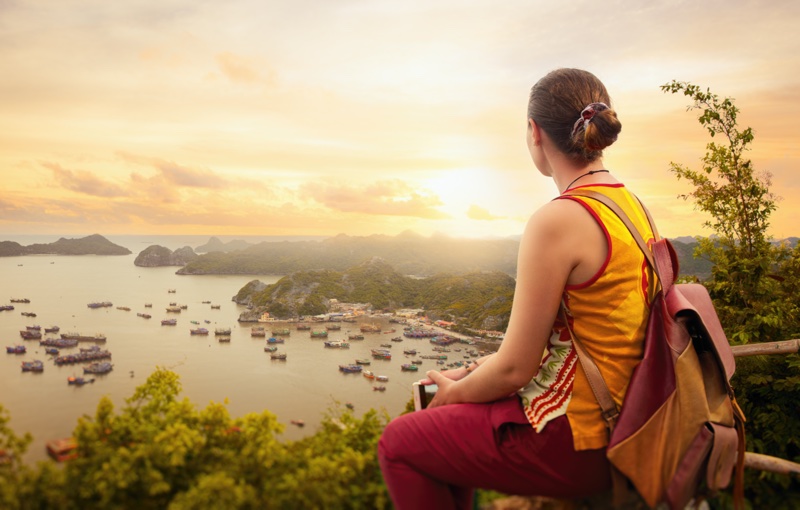 Foreign traveler enjoying the view of the bay of Cat Ba