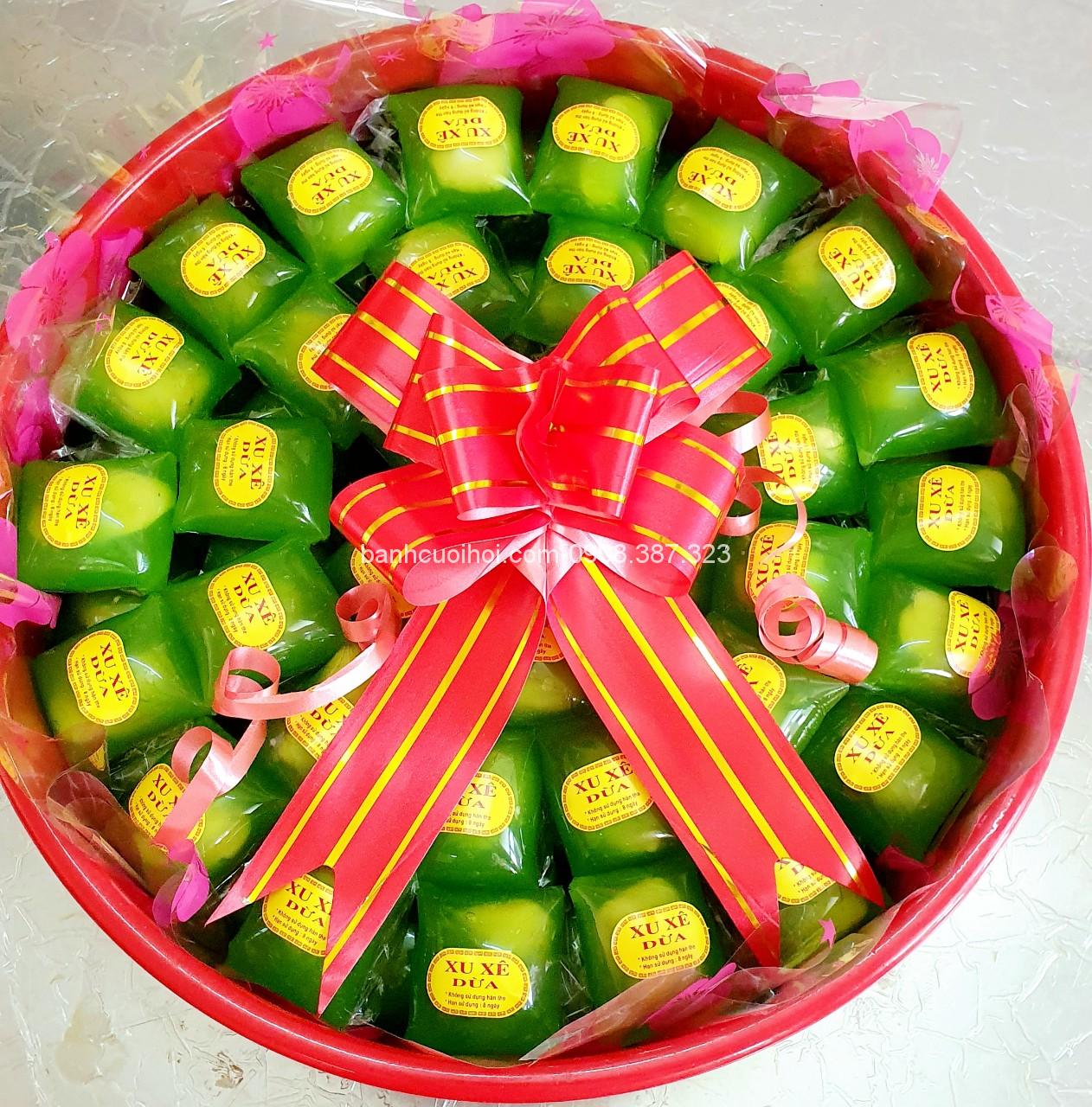 Another significant cake is Banh Phu The (or Xu Xe), known as Conjugal cake. This cake is composed of tapioca flour, pandan, green beans, coconut, and other ingredients, leading to a jelly-like texture. It features a transparent outer layer that reveals a yellow filling inside and is presented in two square boxes. Often appearing at weddings, this cake symbolizes a solid and enduring marriage, representing the promises exchanged between bride and groom.