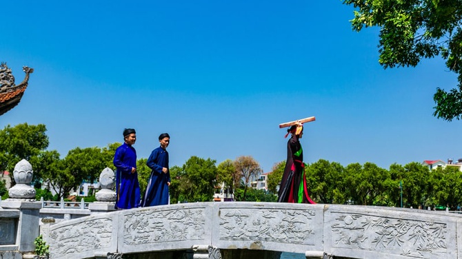 Quan Ho singers walking on a bridge, Bac Ninh, Vietnam