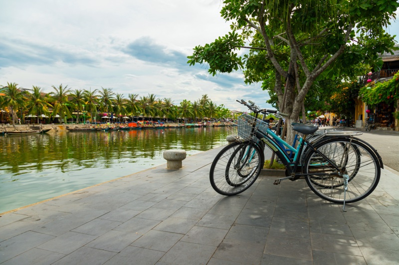 Bicycles parked beside the Thu Bon River in Hoi An Ancient Town