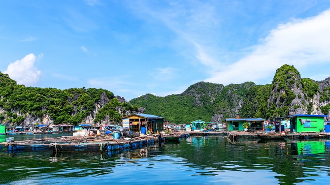 Floating fishing village and rock island in Lan Ha Bay, Vietnam,