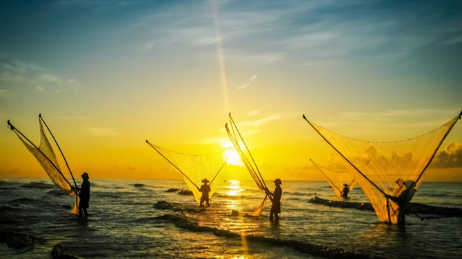 Fishermen working in the fishing village of Hai Hau, Nam Dinh, Vietnam