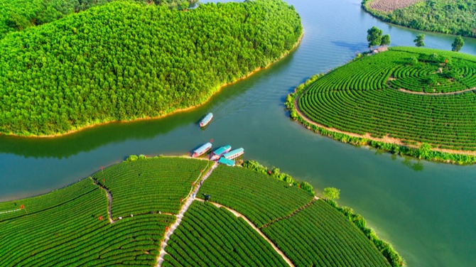 Aerial view of tea Thanh Chuong tea hill, Nghe An, Vietnam.