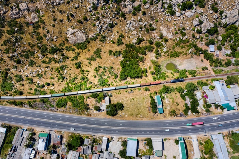 Train and railway at Ca Na area town in Ninh Thuan