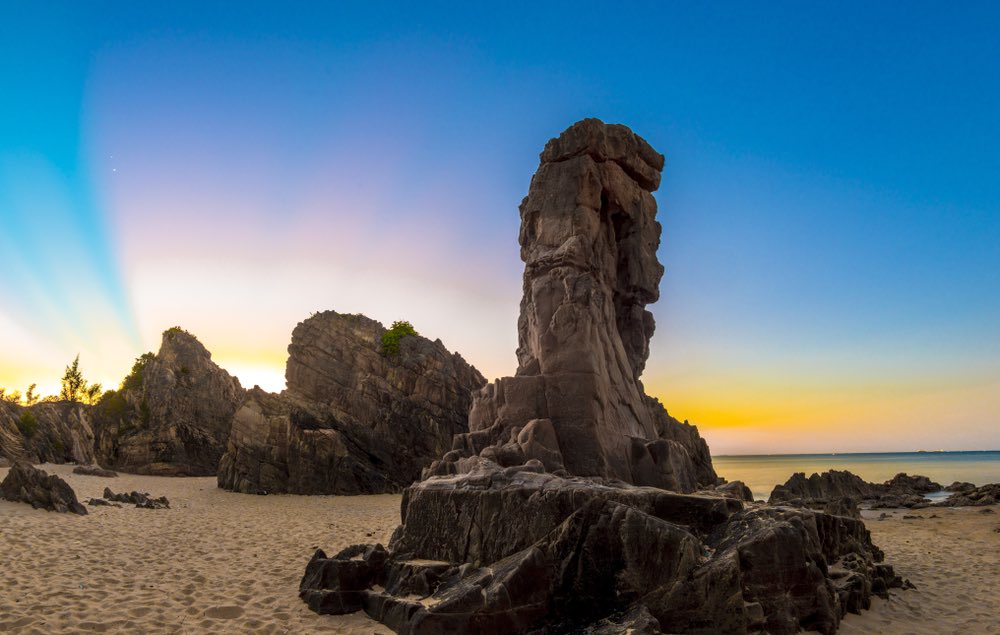 Jumping Rocks (Da Nhay Beach) is located about 25km from Dong Hoi City and features striking rocky formations shaped by nature, displaying a range of awe-inspiring colors. The changing tides create different scenery each visit, making each experience unique. Visitors can also enjoy leisurely walks along the pristine beach, savoring freshly caught seafood such as shrimp, squid, and sea snails purchased directly from local fishermen.