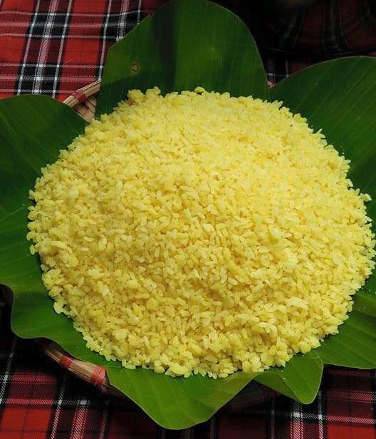 Sticky rice colored vivid yellow, generously topped with crispy fried onion and ground mung beans.