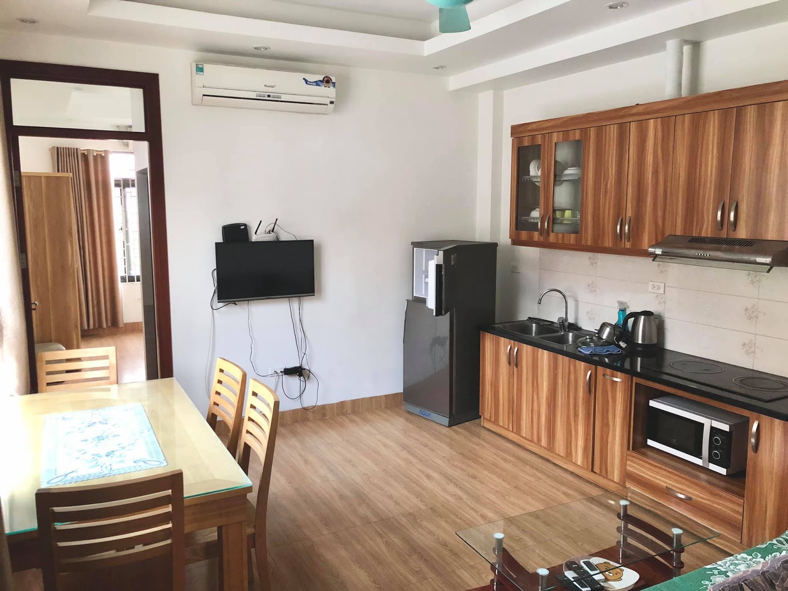 This fully-furnished apartment includes air conditioning, essential furniture, a refrigerator, and a TV.