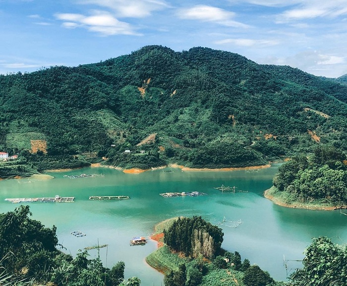 Historically, Thung Nai was a lush valley abundant with deer, which inspired its name—meaning "the Valley of Deer." With the construction of the Da River hydropower plant in the 1980s, the valley transformed into a vast lake that serves as the water source for the plant's operation. The once towering mountains now stand as floating green islands, creating a majestic and picturesque landscape that captivates visitors. Thung Nai is often compared to "the second Ha Long Bay on land" in Northern Vietnam, after Tam Coc Bich Dong in Ninh Binh province.