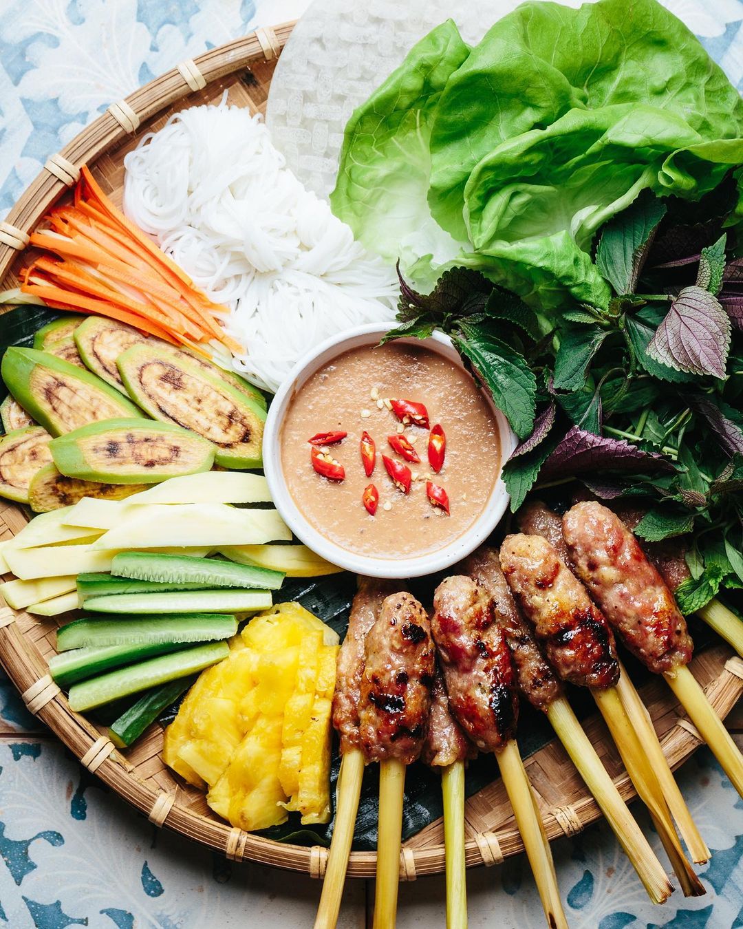 Hue lemongrass pork skewers stand out from regular pork skewers because ground marinated pork is skewered onto lemongrass and grilled over charcoal. A satisfying plate of nem lui is generally served alongside fresh vegetables and slices of cucumber wrapped in rice paper.