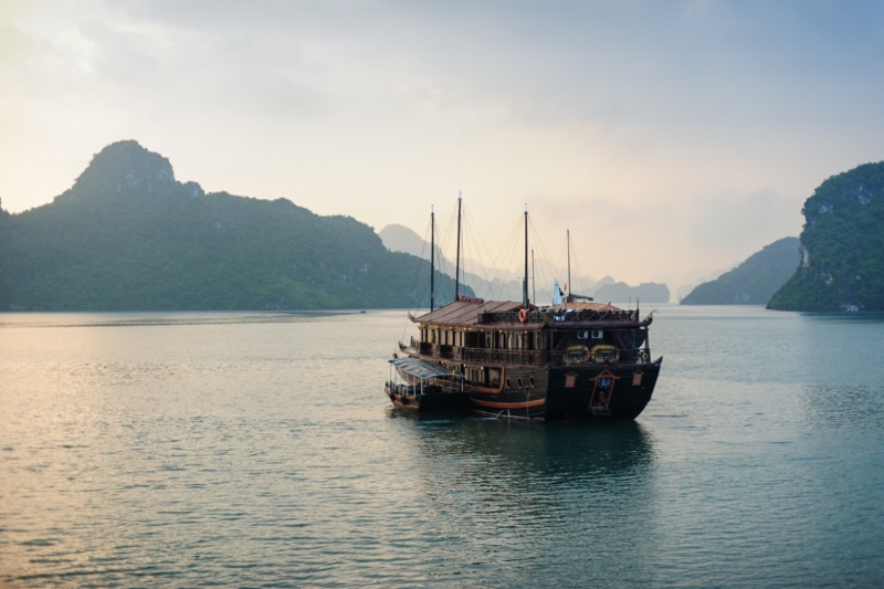 Arrive at Hanoi train station in the morning, check-in at your hotel, and have breakfast. Then, board a bus to Halong Bay, arriving around noon. Embark on a traditional wooden boat for a cruise, where you can relax, enjoy the scenery, and swim. Visit a floating fishing village, provided the weather allows. Meals are included. Overnight on board.