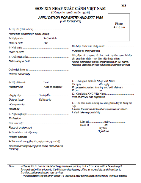 The M3 form is required for all foreign passengers arriving in Vietnam by air. This form will be distributed to you either on the airplane or upon your arrival at a Vietnamese airport. Once you have filled in the form, please hand it to the immigration officer, who will stamp your passport with a visa-on-arrival or grant you an entry stamp if you already have a pre-arranged visa. To save time, you can also download the form and complete it beforehand.